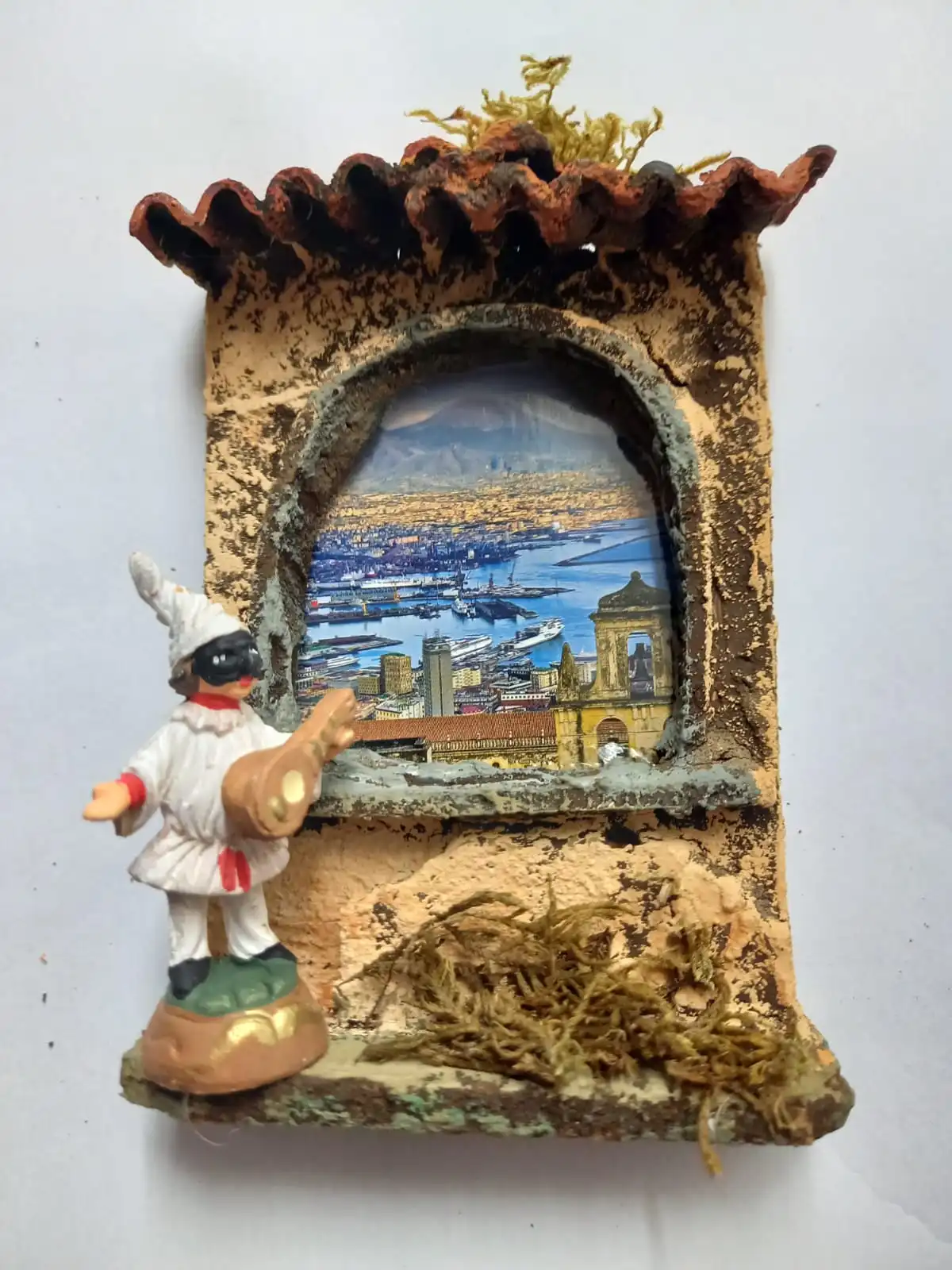 Magnete Artigianale in Sughero con statuina in terracotta di Pulcinella mentre suona il mandolino, il tutto creato e dipinto a mano dal maestro presepiale di San Gregorio Armeno. Dietro, una piccola finestrina ad arco con lo sfondo del golfo di Napoli su Castel dell’Ovo e Vesuvio.